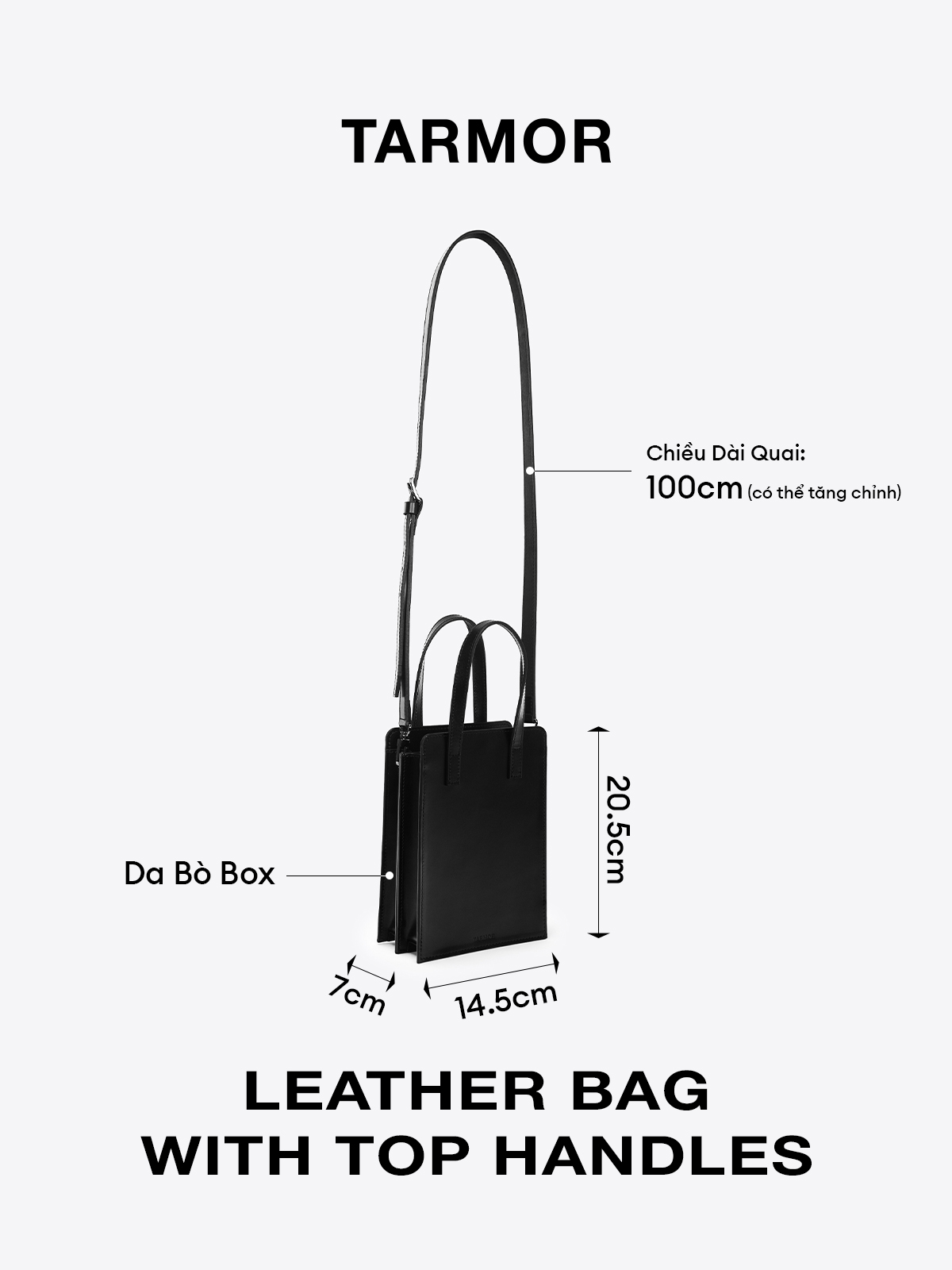 Túi da có hình hộp chữ nhật đứng, có quai đeo vai và quai xách tay, màu đen.